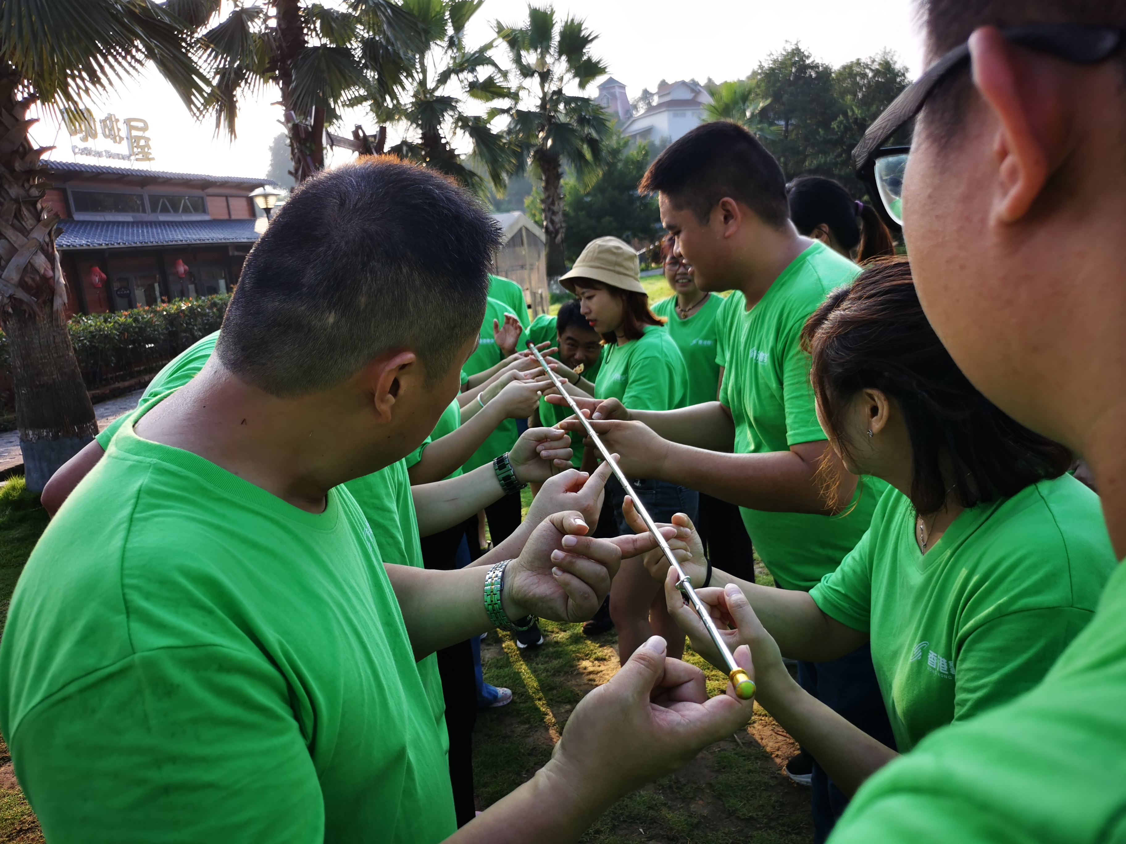 最后我們挑戰(zhàn)了本次看似簡單、難度卻最大的活動項目—《齊眉棍》,這個游戲聽起來很簡單,但玩的時候就不一樣了,本應緩緩放到地上的棍子,通常都是棍子不自覺的往上升!此項目主要考察大家的團隊精神,還有就是不輕言放棄的精神,強調團隊交流的重要性、秩序性。