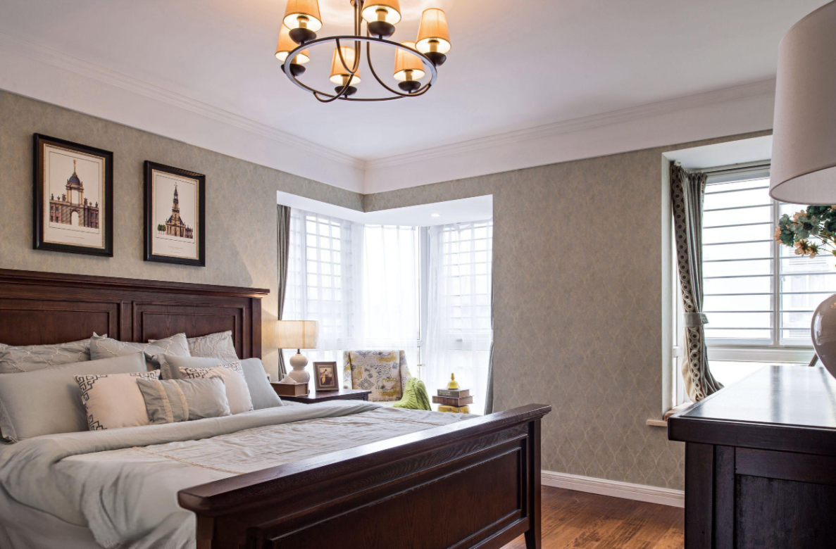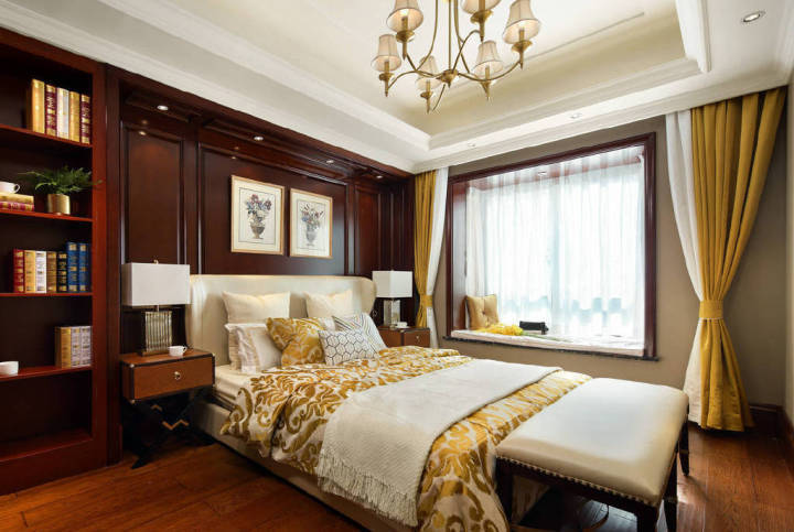 淺色系的背景色保證整個空間不會過于壓抑,主體色就可以采用復(fù)古色了。美式家具多為褐色和棕色,搭配相近色的地板,復(fù)古氣息滿滿,兼具濃郁的歷史文化感。