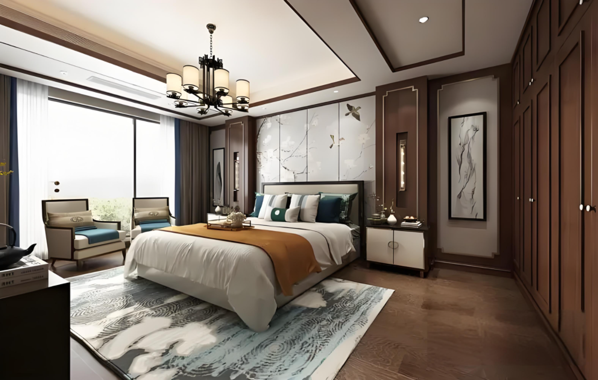 主體色:深棕、紅木色、深灰色。新中式多搭配紅木等實木家具,或者其他帶有中國元素的家具。